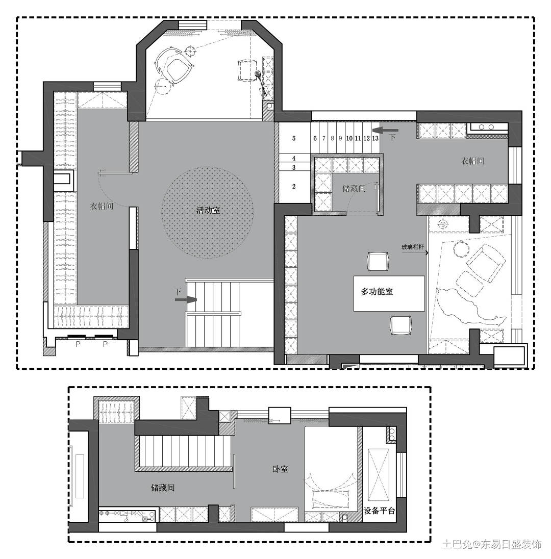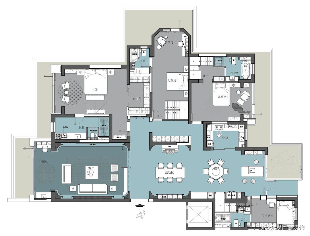 该户型结构的改造重点是在两个儿童房做局部的隔层,靠近房间的窗户采光面仍然保留了挑高区域,既保证了通风采光又解决了空调内机的放置问题。