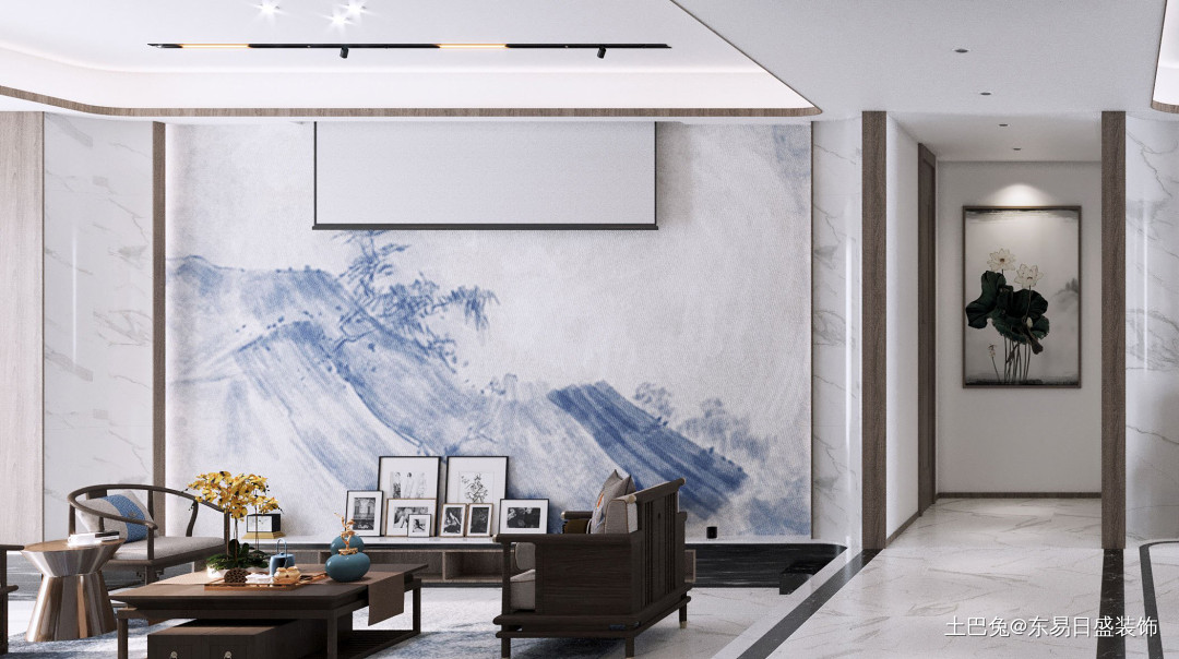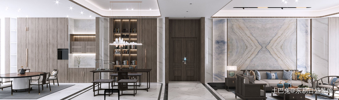 客厅利用借景的手法,将蜿蜒的山脉引入空间装饰中,江山取象中国巨龙,龙脉绵延千里,寓意深刻,风水暗示,有靠山可依,可藏风聚气。