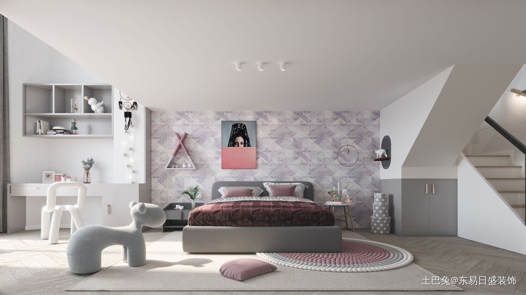 梦幻是女孩房亘古不变的主题,色调以米灰色为主,点缀以紫色与粉色床品打破空间的沉闷,在柔和的设计中,让空间呈现惬意愉快的气氛。
