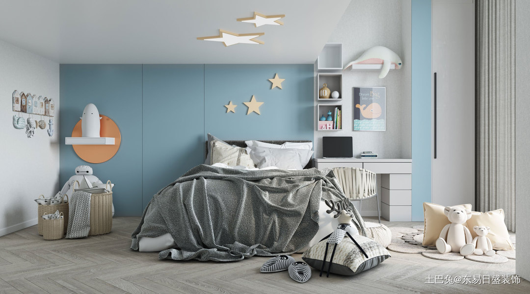 男孩房以灰作为主体色调,高饱和度的蓝色则使空间更具活力,体现出小男孩的灵气活泼。