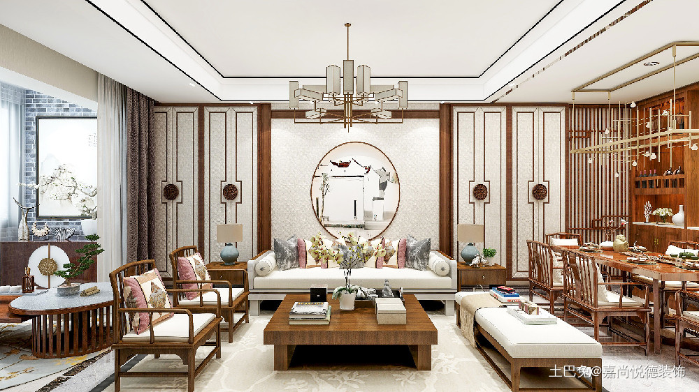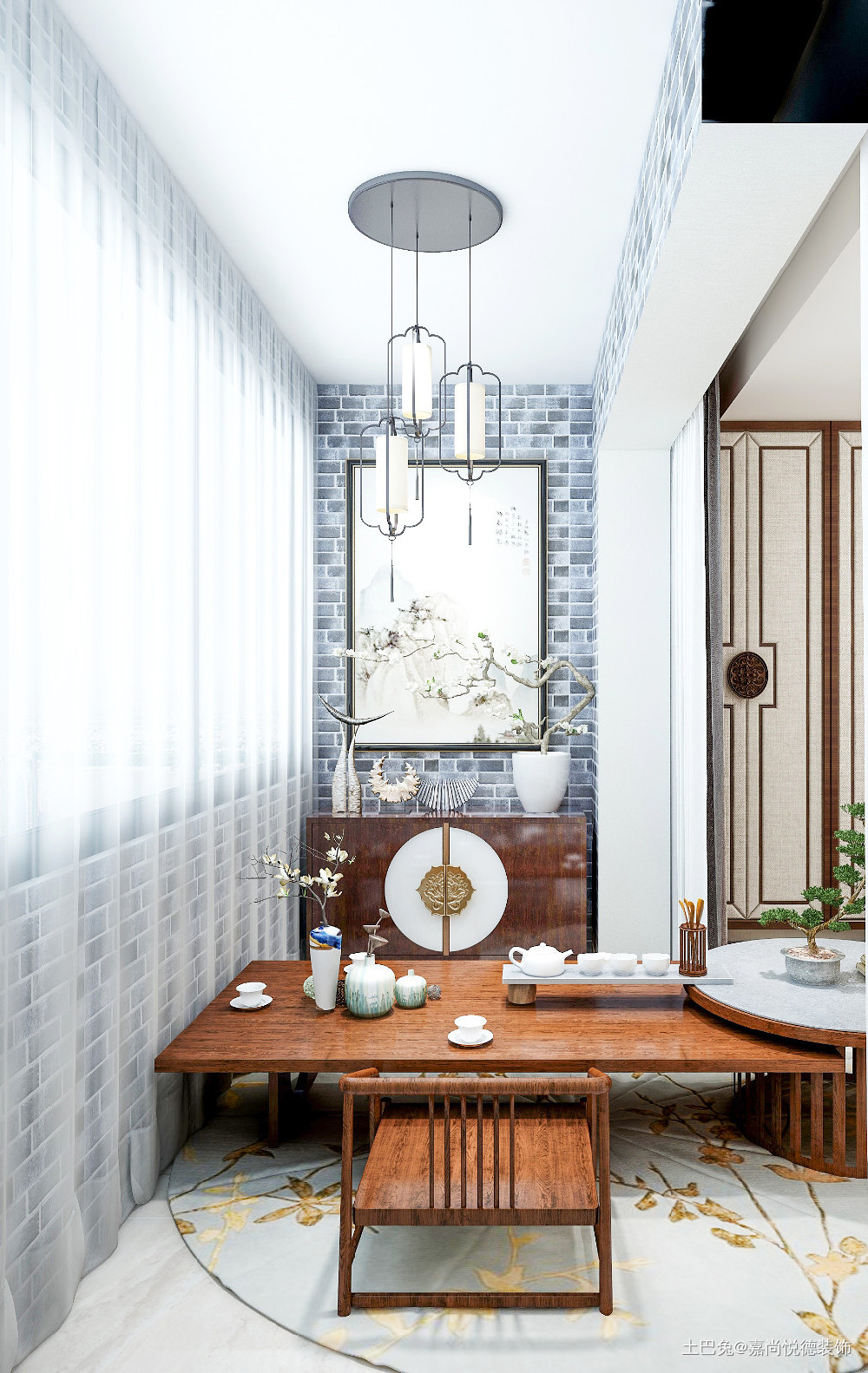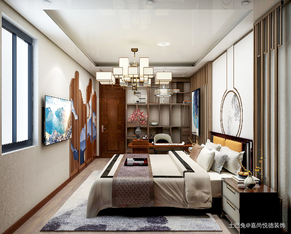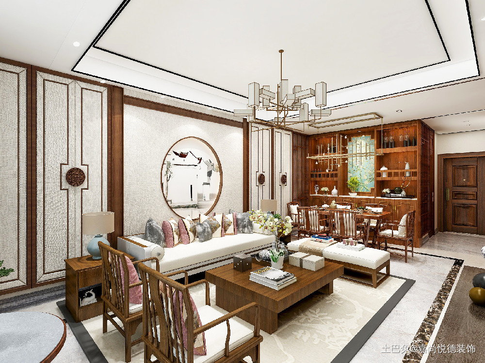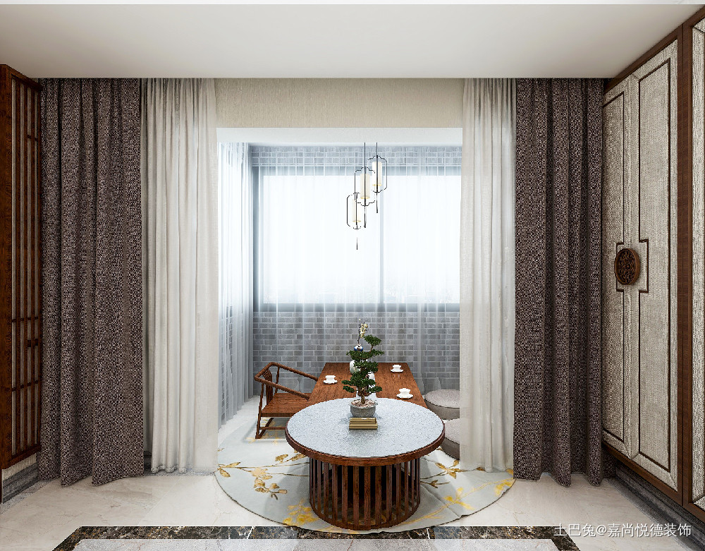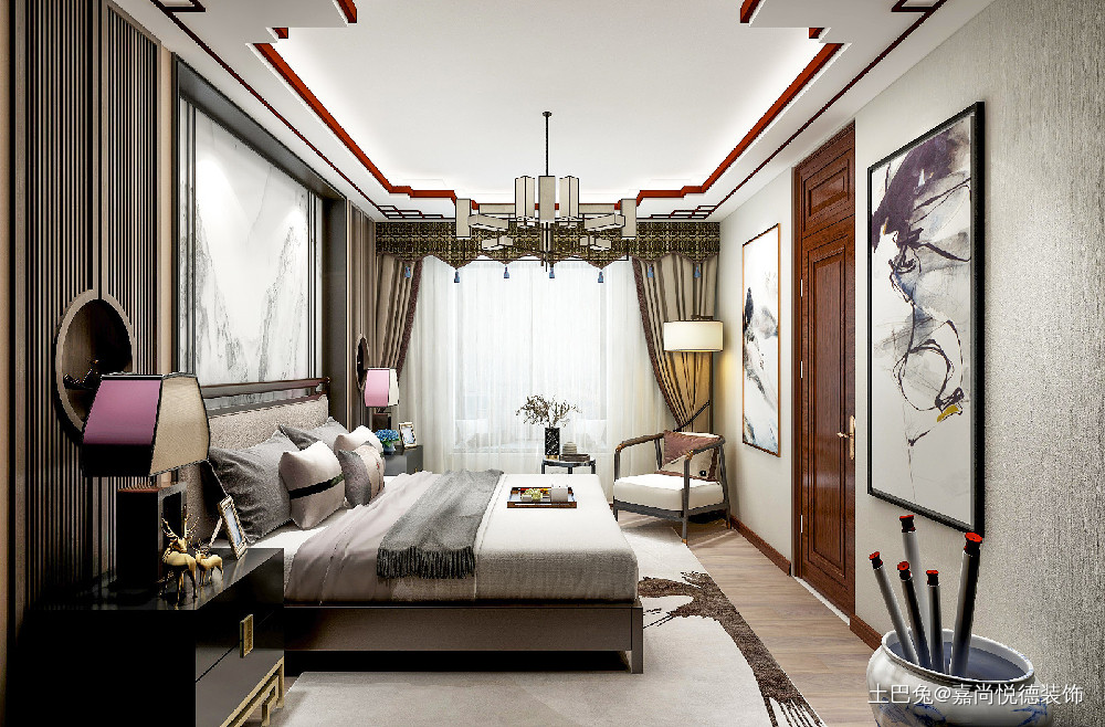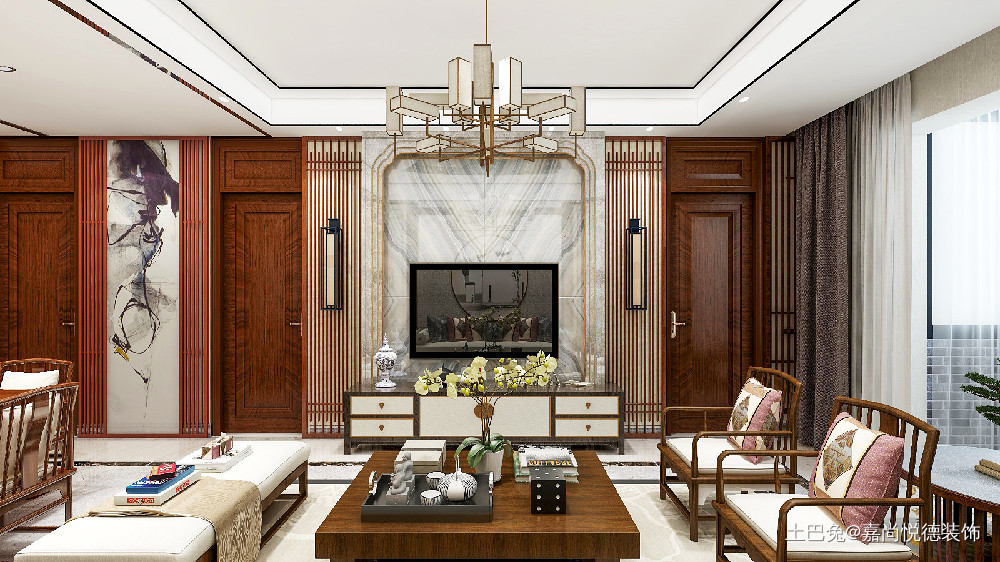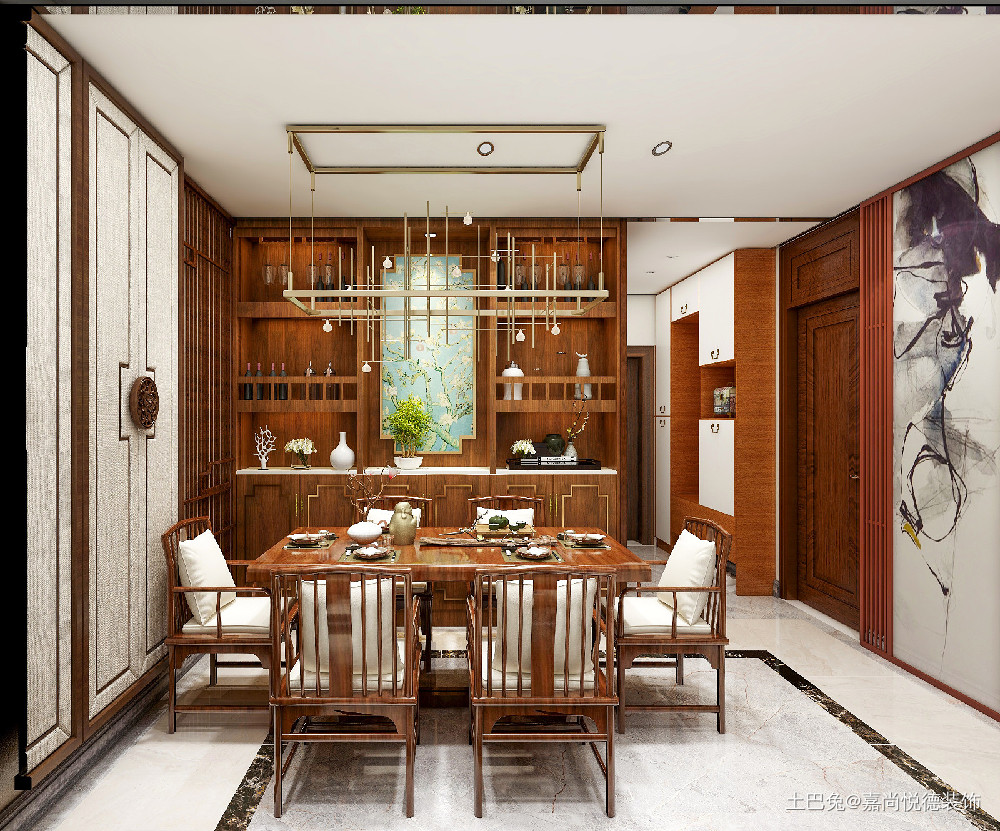 设计以新中式为主,石材和金色的点缀不仅让新中式风格展现沉稳,还可以让居住环境更高雅,精致。墙面整体大理石的设计以及铜条的装饰,使空间尽显高端、大气。